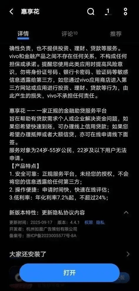 “惠享花”的违规之路,始于资质与业务的严重错配。工商信息显示,该APP的开发主体为杭州如盈广告策划有限公司(下称“杭州如盈”),成立于2023年3月,注册资本仅100万元,经营范围集中在广告制作、数据处理等普通业务,并无任何金融相关业务许可。但就是这样一家无金融资质的公司,却在应用商店上架网贷类APP,公开开展贷款中介服务。