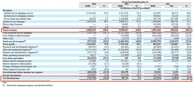 但代理商规模的扩大,却未能带来长期的业绩增长。2024年,怪兽充电移动设备充电订单同比下滑12.6%至5.74亿次,公司全年营收18.94亿元,同比下滑36%;并由盈转亏,净亏损1353万元。