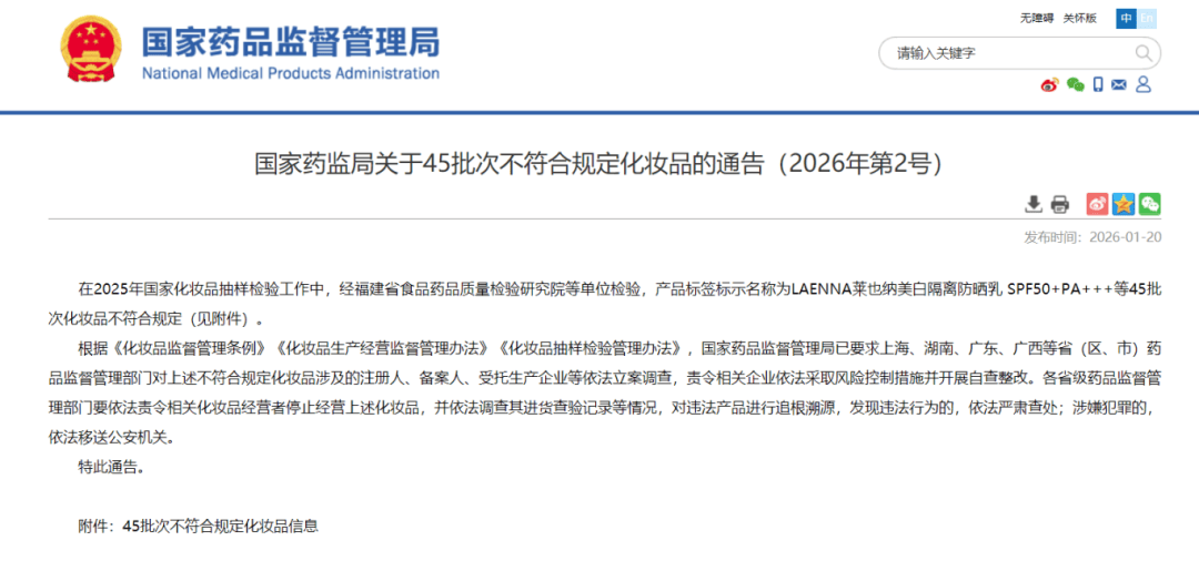 1月19日,国家药监局发布45批次不合格化妆品通告。
