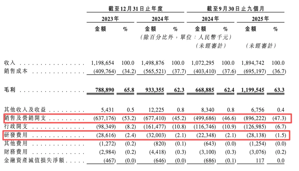 半亩花田的销售及营销开支常年占据收入的近半壁江山,2023年至2025年前9个月,这项费用分别为6.37亿、6.77亿和8.96亿元,占总收入的比例分别为53.2%、45.2%和47.3%。