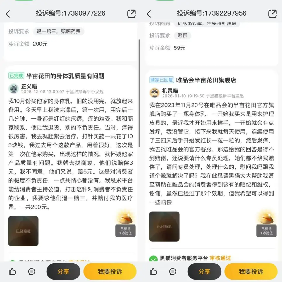 在第三方消费者投诉平台上,涉及半亩花田的投诉累计近300条,主要问题集中在产品使用后引发皮肤过敏以及售后服务质量不佳方面。在社交平台上,有消费者无奈坦言,因产品价格不高,往往只能“吃哑巴亏”。