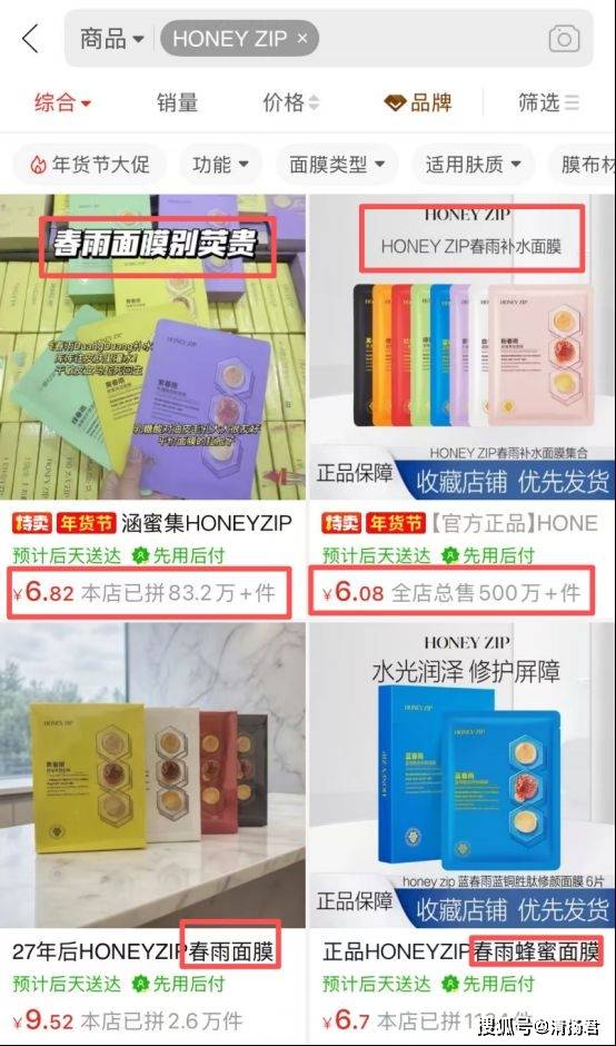 有意思的是后续。被狠狠打假、陷入争议的HONEY ZIP,市场表现急转直下。不过现在某些平台的商家在销售该产品时仍在大肆宣传“春雨”面膜,而且销量500万+的都有。这不由让人质疑杭州伸美的管理能力和营销策略。