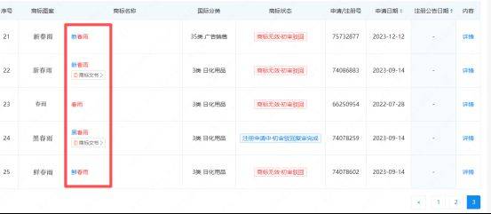 不仅如此,清扬君舆情分析中心查询发现,杭州伸美先后申请春雨、黑春雨、新春雨等共计25个相关商标,而且几乎都是3类日化用品、第35类广告销售的商标。
