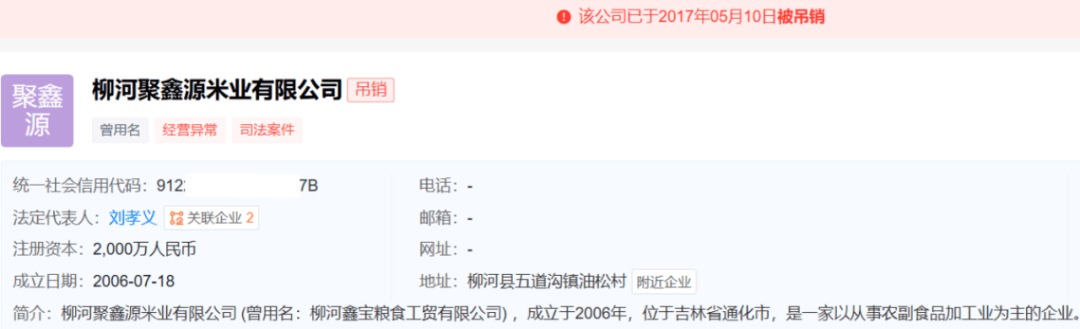 天眼查显示,聚鑫源公司成立于2006年7月18日,注册资本2000万元,法定代表人刘孝义,但是该公司在2017年5月10日已经被吊销。