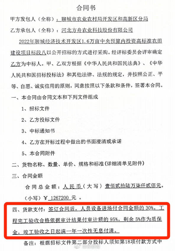 “合同总金额为126.72万元,因后期增加了26吨货物,实际项目金额变更为131.04万。”河北方舟农业负责人李先生向记者提供了公司与聊城市农业农村局开发区和高新区分局签订的项目合同,其中货款支付方式明确约定:“签订合同后,人员设备进场付合同金额的30%,工程完工验收合格依据审计结果付审计额的95%,剩余5%作为质保金,竣工验收之日起满一年一次性无息付清。”