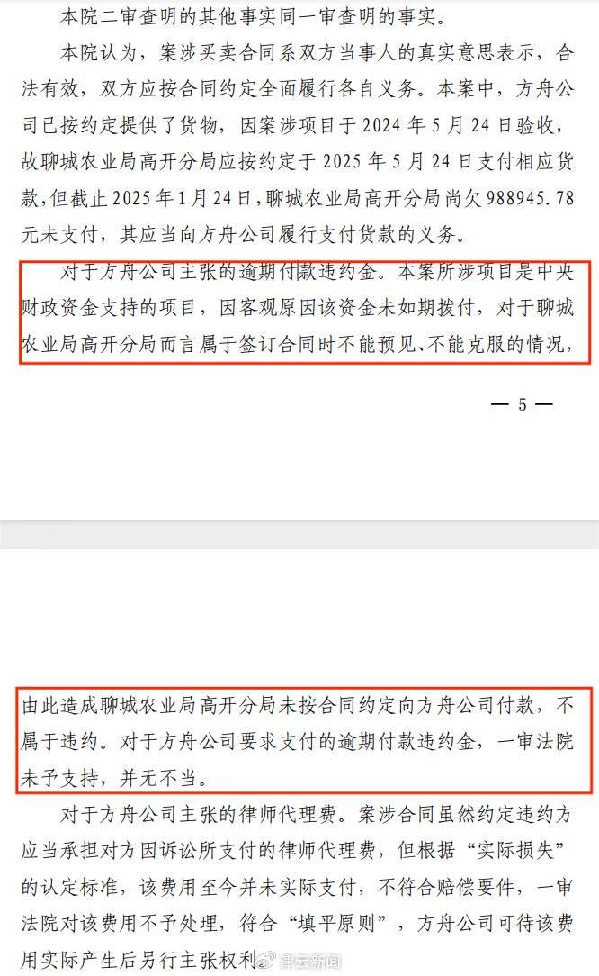 2025年5月30日一审判决,法院支持了河北方舟农业追讨欠款的诉求,判决聊城市农业农村局开发区和高新区分局于判决生效后十日内支付欠付货款988945.78元,却驳回了公司主张的逾期付款违约金及被告承担原告律师费的诉求。