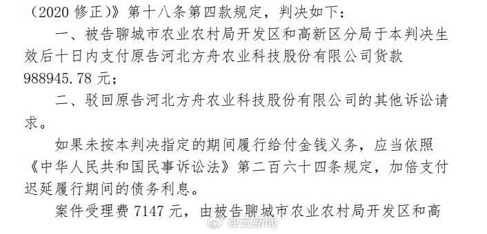 因多次沟通无果、欠款问题迟迟未解决,无奈之下,河北方舟农业将聊城市农业农村局开发区和高新区分局告上法庭。