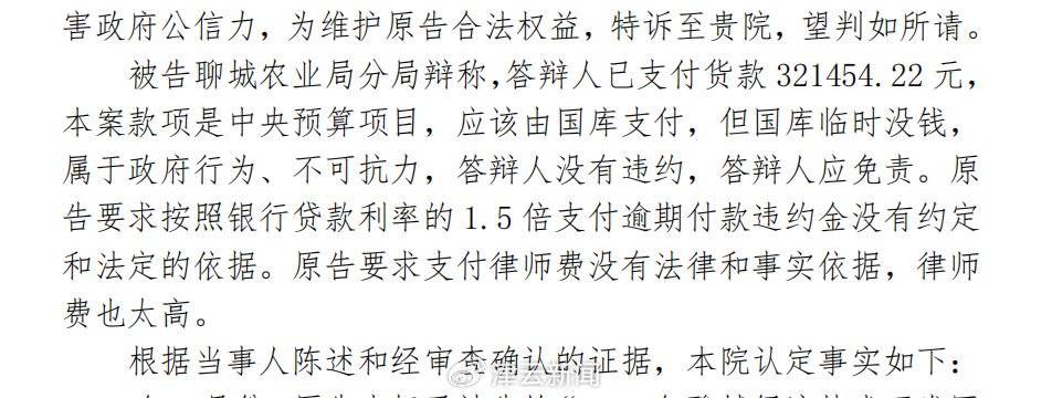 对此判决,河北方舟农业向聊城市中院提起上诉,二审最终维持原判。李先生对利息诉求被驳回尤为不满:“法院说农业农村局没有钱是不可抗力,不能预见的,可我们咨询过律师,不可抗力通常指重大自然灾害、战争等无法预见、不能避免的情况,财政紧张怎能算是不可抗力?”