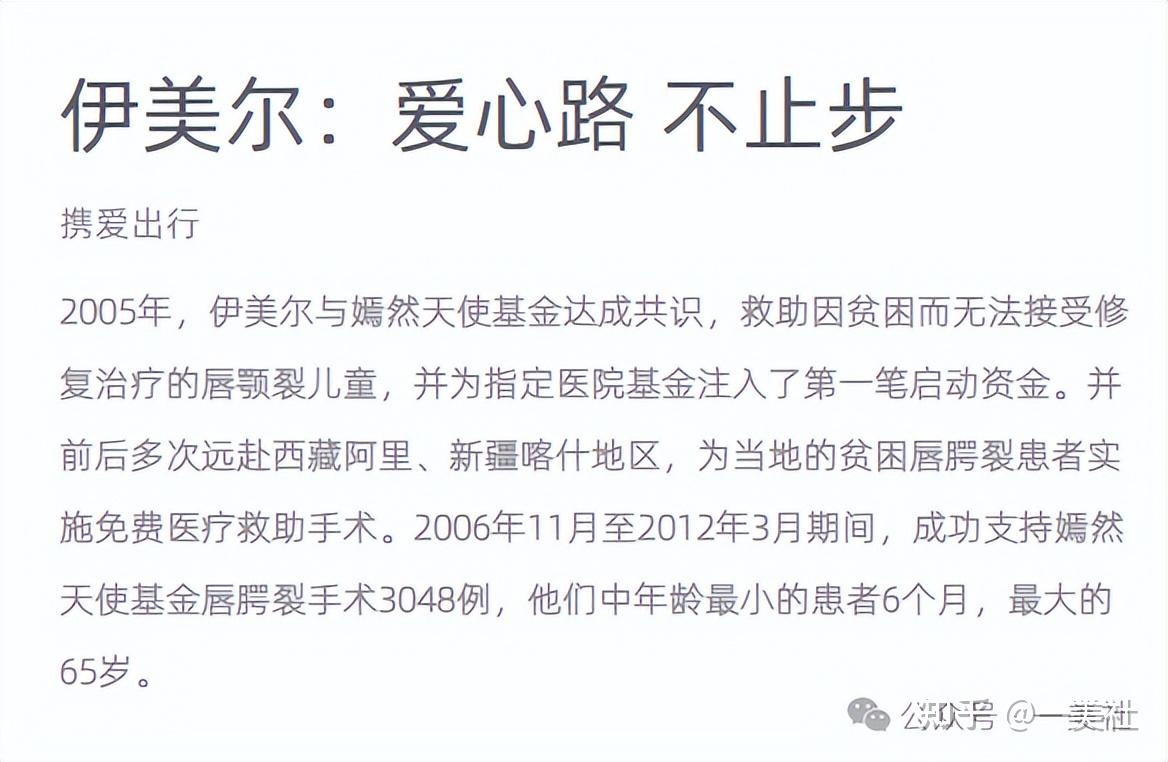 从2006年到2013年,嫣然基金完成的逾9000例手术中,约三分之一由伊美尔完成。伊美尔不仅投入了医疗团队和设备,每年还自行安排额外免费手术,并多次组织医疗队远赴西藏、新疆等边远地区开展救助。
