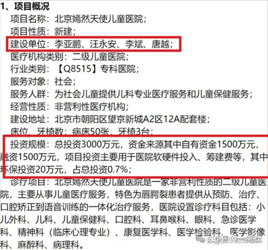 公开资料显示,在向北京市卫生局申请设置的批复文件中,发起人名单包括李亚鹏、汪永安、李滨、投资人唐越等。李滨更是受聘担任了嫣然天使儿童医院的首任院长,伊美尔公共事业部的人员整体转入医院,成为初创团队的核心。汪永安和李滨,这对被称为“医美双雄”的搭档,为嫣然医院注入了关键的行业资源、管理经验和初期运营团队。