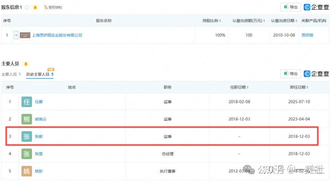 深圳市思妍丽美容有限公司历史人员为张毅,其曾担任该公司监事,于2018年12月份卸任。