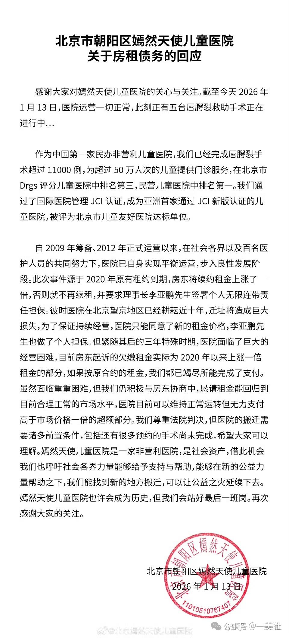 近日,嫣然天使儿童医院(以下简称“嫣然医院”)因房租债务问题受到广泛关注。1月13日,李亚鹏转发北京市朝阳区嫣然天使儿童医院关于房租债务的回应,并配文称“嫣然天使儿童医院也许会成为历史,但我们会站好最后一班岗”。