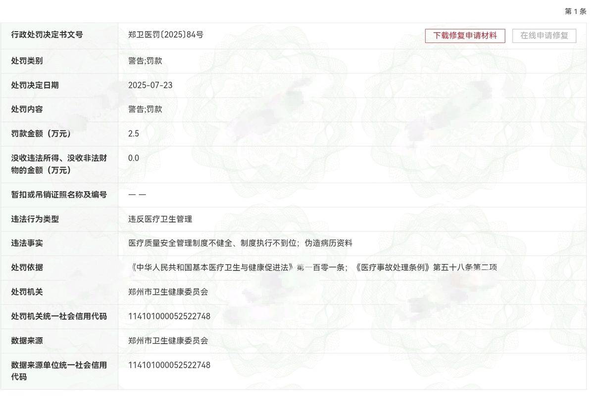 2025年7月23日,郑州市卫生健康委员会对该机构下达了行政处罚决定书,文号为郑卫医罚[2025]84号。该机构因违反医疗卫生管理规定,医疗质量安全管理制度不健全、制度执行不到位,以及伪造病历资料等行为,被处以警告并罚款2.5万元。此次处罚依据《中华人民共和国基本医疗卫生与健康促进法》第一百零一条和《医疗事故处理条例》第五十八条第二项等相关规定执行。