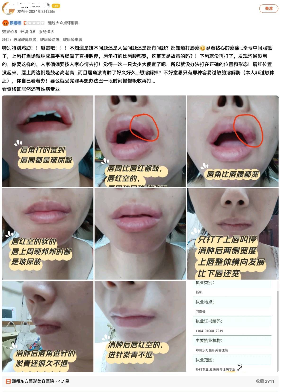 2024年8月25日,一位消费者发布了差评。该消费者表示,不知道是该机构医生的技术问题还是人品问题,注射唇部后变得特别肿。该消费者在注射时经历钻心的疼痛,上唇注射当场就肿成了香肠嘴,该消费者直接叫停了注射。