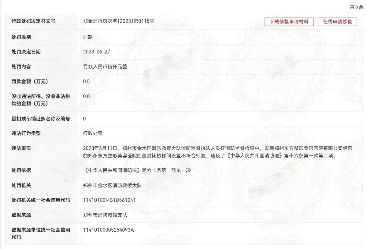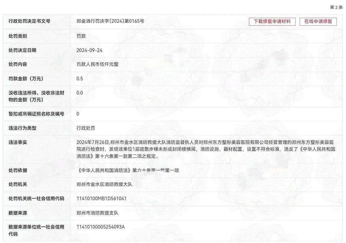 天眼查显示,一个多月前,郑州东方整形美容医院因在百度、小红书、抖音等多个平台未经审查发布虚假医疗广告,使用伪造患者术前术后对比照片(含“EAST东方整形”虚假标识)、虚构“4小时内医生坐诊”“术后效果立竿见影”等宣传内容,且未取得《医疗广告审查证明》,违反《广告法》《医疗广告管理办法》等规定。