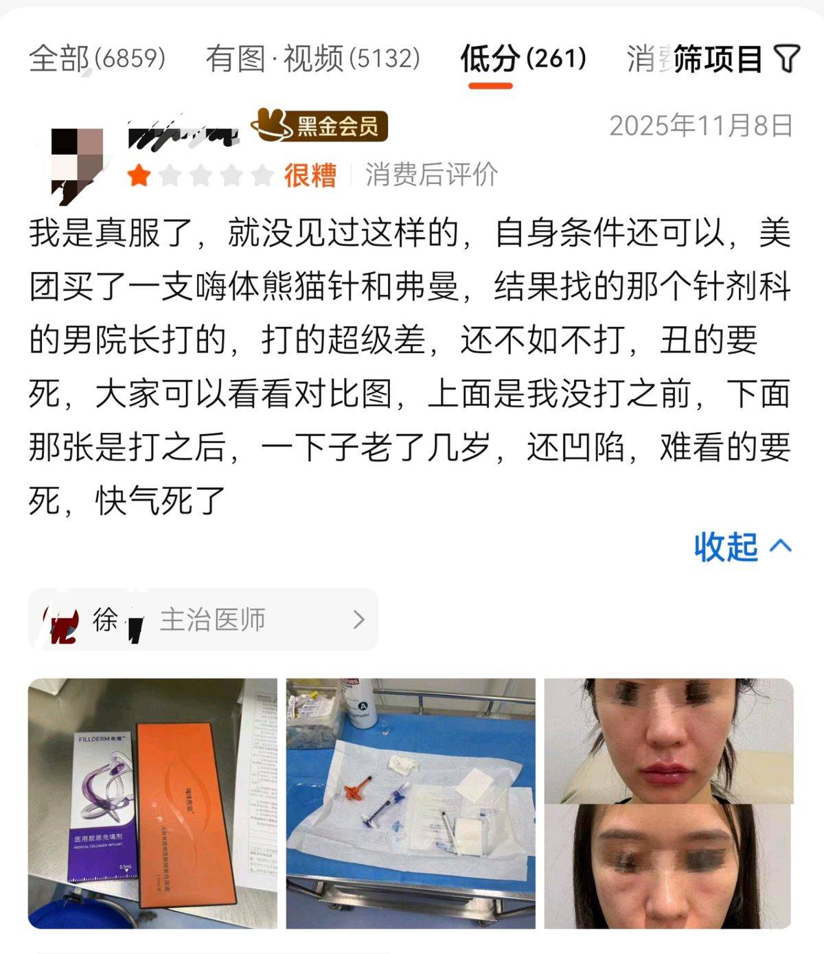2025年11月8日,还有消费者发布评价。该消费者表示其在美团买了一支嗨体熊猫针和弗曼,由针剂科的男院长为其注射,打得超级差,还不如不打。