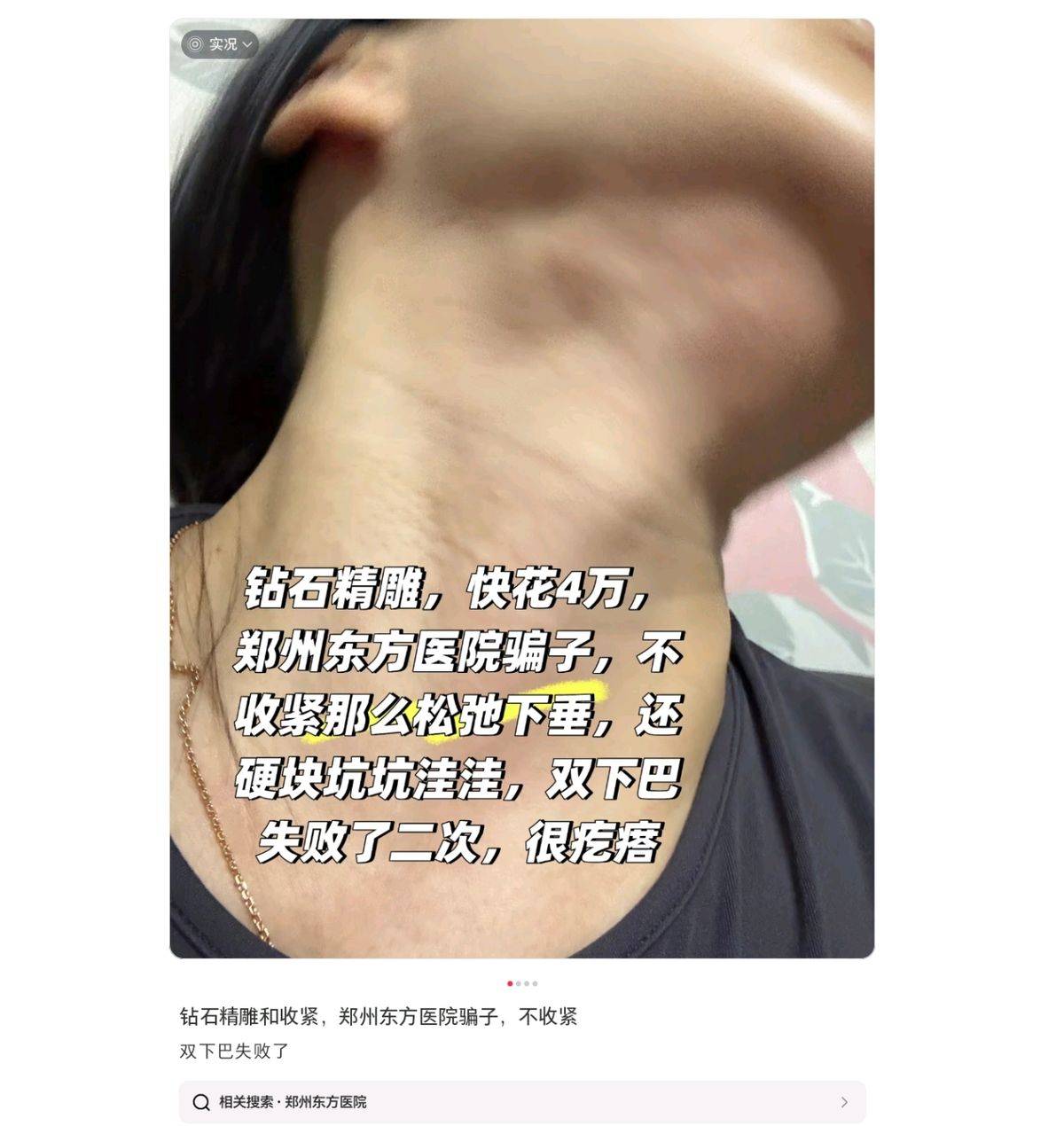 2025年8月22日,有网友在小红书社交媒体上发布了一则帖子。据该网友描述,其在郑州东方整形美容医院做了钻石精雕,花费近四万元。该网友表示,做完项目后的效果还是很松弛,并且出现了硬块和坑洼。