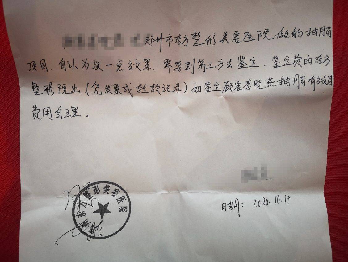 文章指出,2020年10月14日,郑州消费者李女士向媒体反映,其在2019年9月于郑州东方整形美容医院接受抽脂手术,支付费用两万六千元,但术后未达到预期效果。李女士称,该机构曾承诺术后三个月可见成效,但期限届满后,又以需半年恢复期为借口拖延,最终仍未实现塑形目标,且抽脂部位出现异常增重十余斤的反效果。李女士多次与该机构交涉无果,要求退还手术费用或由原主刀医生重新修复治疗,但均遭拒。该机构辩称手术有效,可提供免费修复服务或通过第三方机构鉴定责任归属。