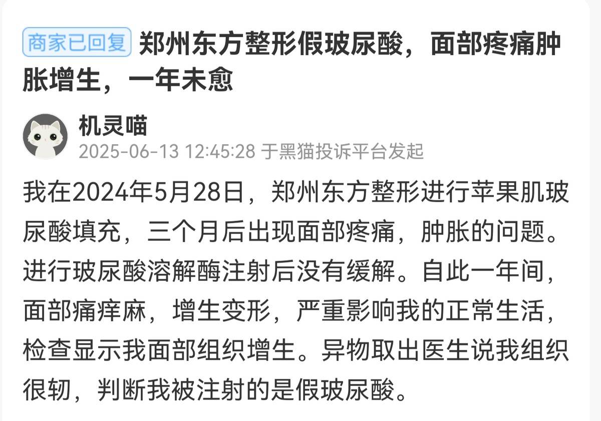 2025年6月13日,一位消费者在黑猫投诉平台上进行投诉。该消费者称其于2024年5月28日在该机构进行了苹果肌玻尿酸填充。三个月后出现了面部疼痛、肿胀的问题。随后,该消费者进行玻尿酸溶解酶注射,但并未缓解。