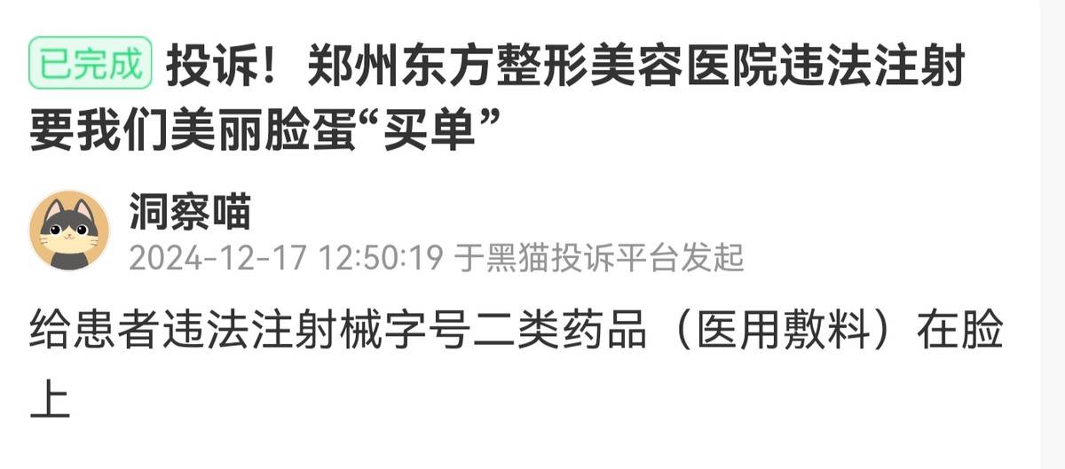 1月10日,一位消费者于黑猫投诉平台发起投诉。该消费者称,其于1月5日在郑州东方整形做皮肤护理,在销售李某诱导并承诺打泪沟填充无恢复期的情况下,注射了未知品牌的药品,且在注射前,该机构医护人员并未向该消费者展示药品信息和剂量。