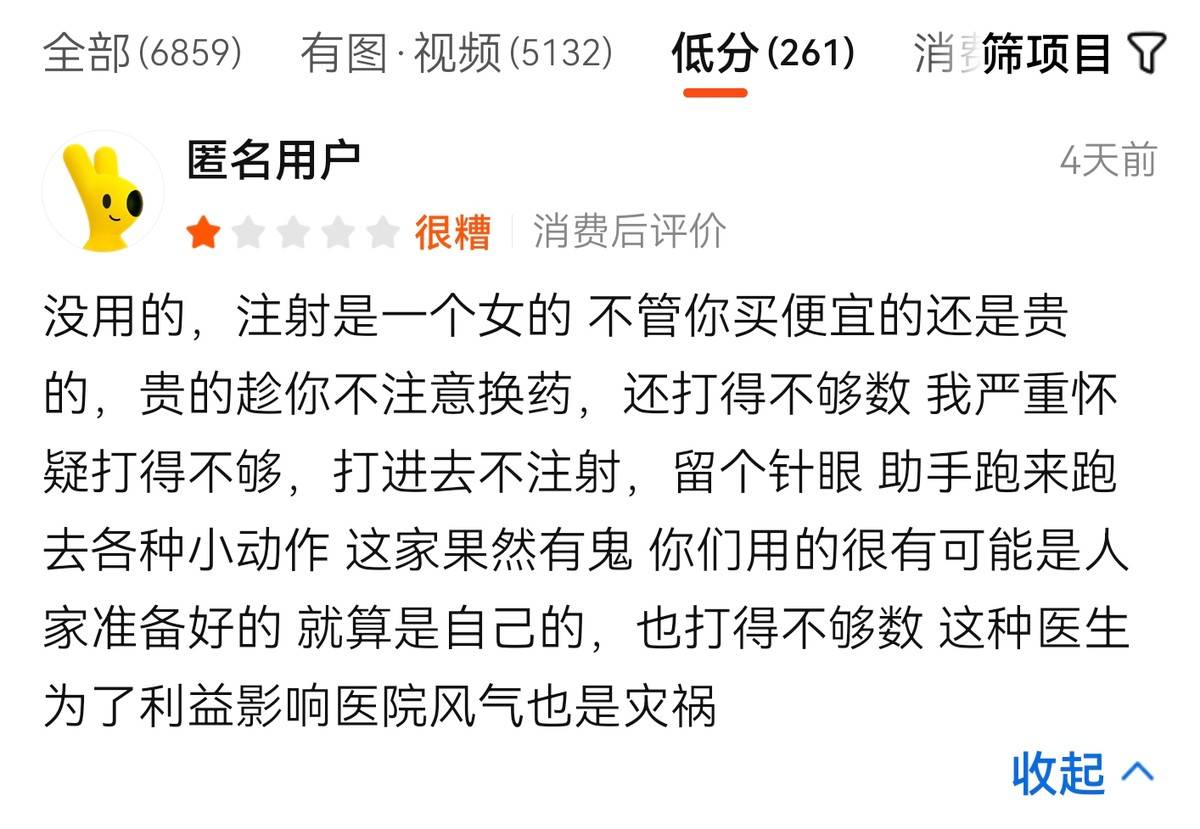 1月21日,有消费者评价称注射没效果,进行注射的是一名女性工作人员,不论消费者购买的是价格便宜的项目还是价格贵的项目,该机构针对价格贵的项目会在消费者不注意时更换药物,且存在注射剂量不足的情况。