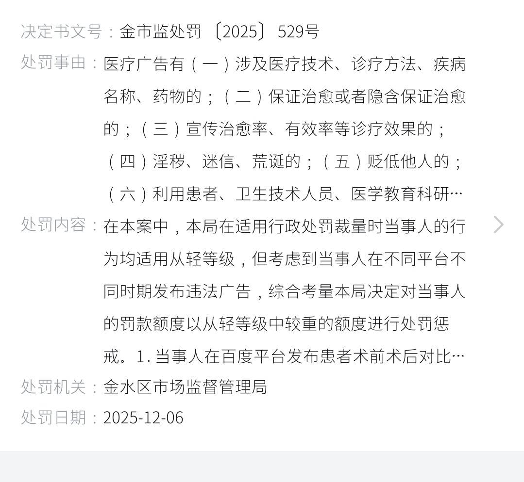 处罚记录提到,在调查中配合整改,但因多次跨平台发布同类违法广告、情节严重,郑州金水区市场监督管理局责令停止发布违法广告、消除影响,并处6万元罚款。