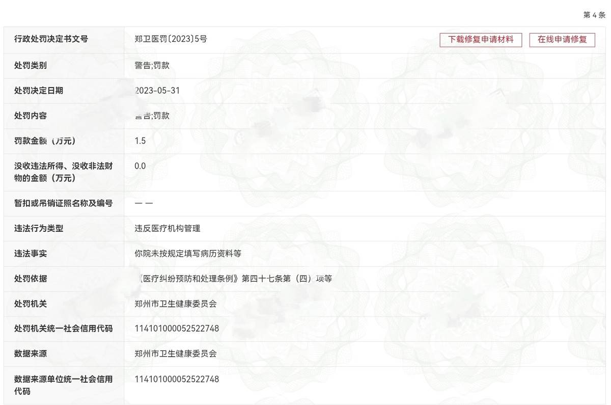 2023年5月31日,郑州市卫生健康委员会对该机构下达了行政处罚决定书,文号为郑卫医罚[2023]5号。该处罚决定书指出,该机构因违反医疗机构管理规定,未按规定填写病历资料等行为,被处以警告并罚款1.5万元。此次处罚依据《医疗纠纷预防和处理条例》第四十七条第(四)项等相关规定执行。