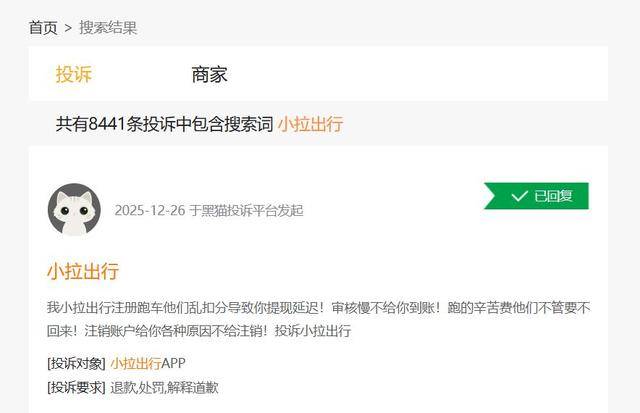 货拉拉旗下出行平台“小拉出行”同样面临监管问题。记者以“小拉出行”为关键词搜索黑猫投诉,显示共有8441条投诉,主要涉及平台无故冻结账号、出行乱扣分、随意封禁司机账号、霸王条款、延时提现、对司机无保障等问题。