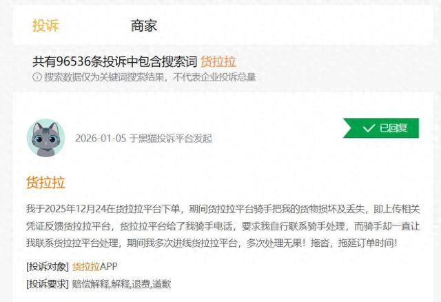 记者搜索黑猫投诉发现,以货拉拉为关键词搜索,共出现96531条投诉,主要内容包括司机投诉货拉拉随意克扣司机行为分、投诉无人处理、机器人客服无法转接人工、霸王条款以及保证金难以退回等问题。