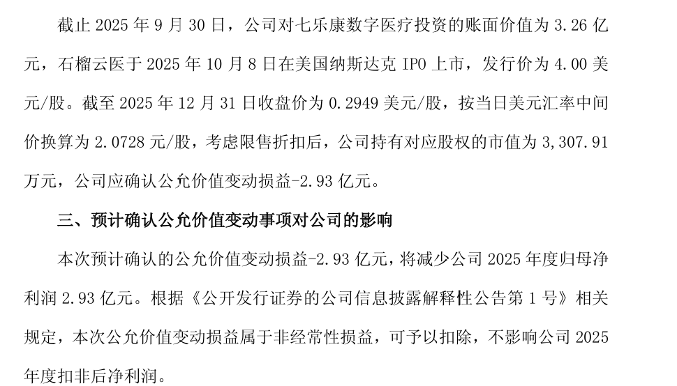 1月6日,步长制药发布公告称,公司对广州七乐康数字健康医疗科技有限公司的投资,2025年预计确认公允价值变动损益-2.93亿元。