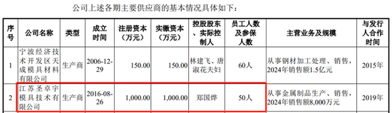 其中,被监管部门提到名字的“江苏圣卓宇模具技术有限公司”,是恒道科技2024年第二大供应商,和2025年上半年第一大供应商,采购项目为钢材、2024年采购金额达612.54万元。对于这家被监管部门问到的第一大供应商,恒道科技披露其注册资本、实缴资本都是1000万元,员工人数及参保人数为50人。