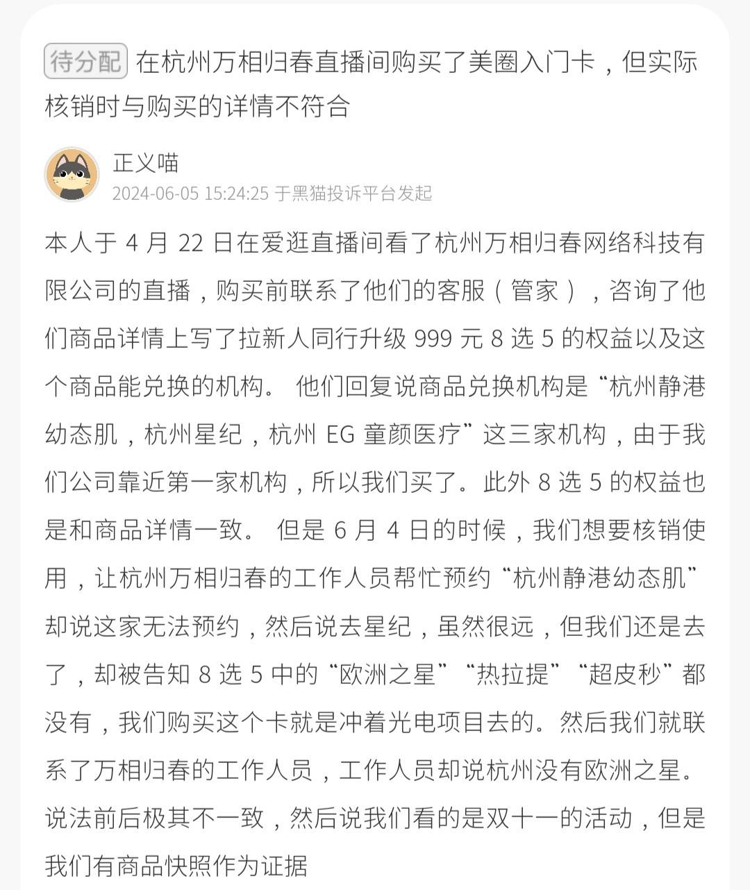 2024年6月5日,黑猫投诉的消费者反馈,其于4月22日在爱逛直播间观看杭州万相归春网络科技有限公司的直播,购买前曾联系客服确认商品详情页所标注的“拉新人同行升级999元8选5”权益及可兑换机构,客服明确回复可兑换机构为“杭州静港幼态肌、杭州星纪、杭州EG童颜医疗”三家,因公司靠近第一家机构,遂决定购买该卡。6月4日,该消费者尝试核销使用,要求预约“杭州静港幼态肌”时被告知无法预约,转而预约“星纪”机构,虽距离较远仍前往,到场后却被告知所购权益中的“欧洲之星”“热拉提”“超皮秒”项目均无法提供,而其购卡初衷正是为体验光电类项目。