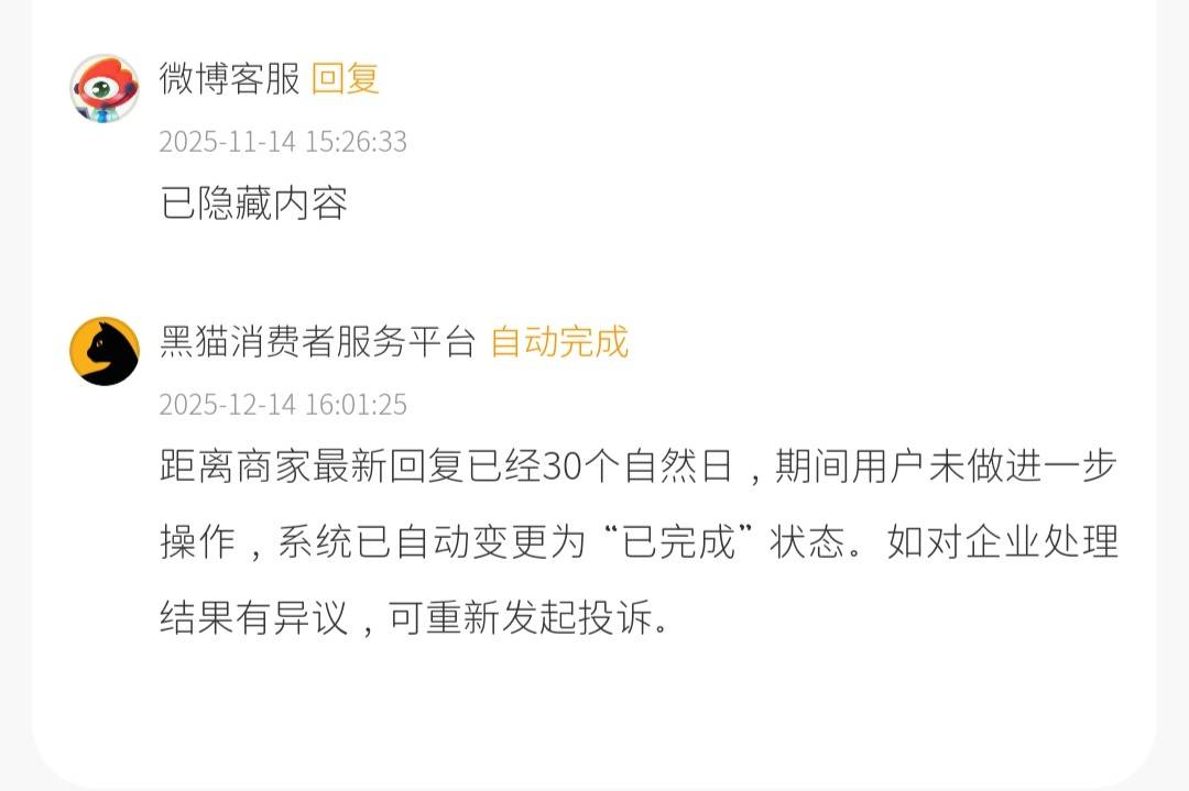2025年11月14日,微博客服对该消费者进行了回复,一个月后,该投诉因消费者逾期未处理,由系统自动变更为“已完成”状态。
