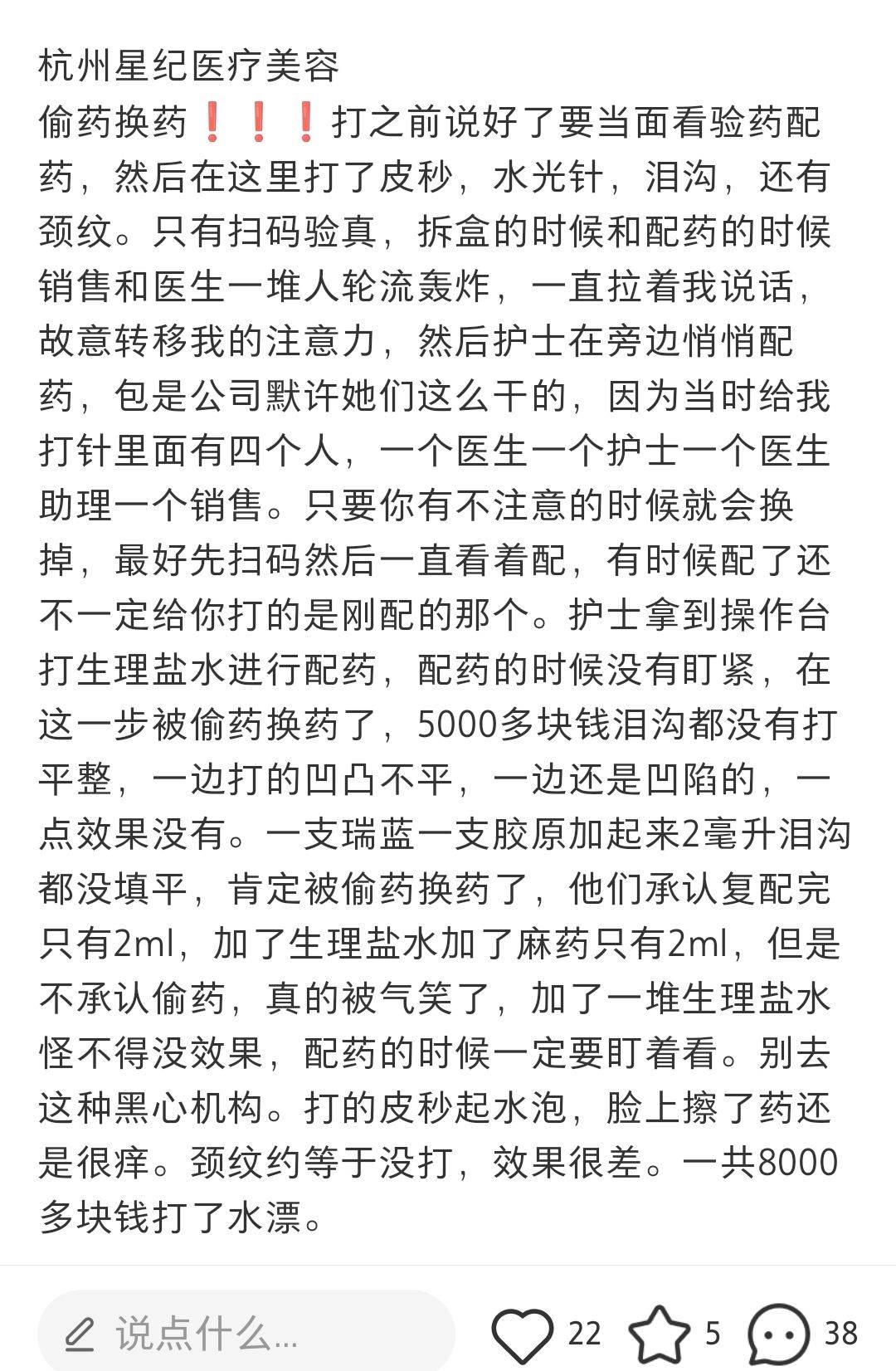 1月15日,有网友在小红书发文控诉杭州星纪医疗美容偷药换药。该网友称,已经提前与机构沟通好,打之前要当面看验药配药,结果到店后只有扫码验真。