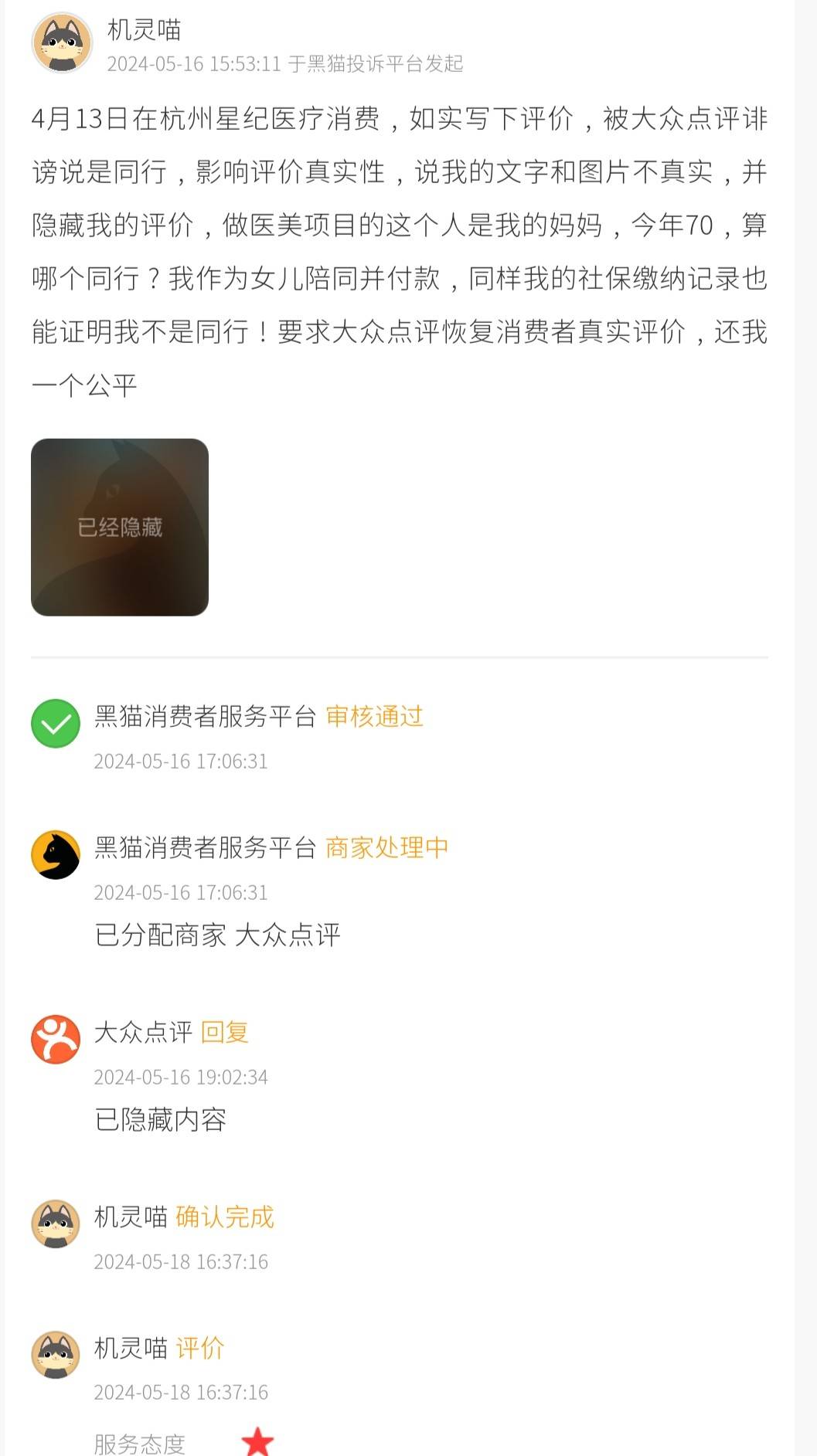 2024年5月16日,一位消费者反馈称,其于4月13日陪同70岁的母亲在位于杭州的星纪医疗美容机构接受医美服务,并在大众点评平台如实发表消费评价,却被大众点评以“疑似同行”为由质疑评价真实性,称其所发布文字与图片不实,并将评价内容隐藏。该消费者表示,陪同就诊并代为付款的是其本人,与商家并无竞争关系,其社保缴纳记录亦可证明非同行身份,认为平台无正当理由限制真实用户发声,要求大众点评立即恢复其评价内容,保障消费者正当表达权利。大众点评回复后,该投诉变更为“已完成”状态,该消费者对其回应给出了一星评价。
