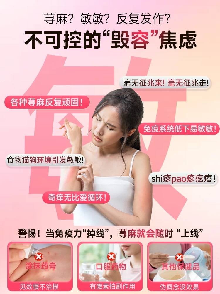 此外,该店铺在宣传中还将普通膳食营养补充剂与疾病治疗绑定,甚至暗示产品优于正规医疗手段。在该产品宣传中,标注有“击退荨麻敏感肌”“荨麻?敏敏?反复发作?不可控的‘毁容’焦虑。各种荨麻反复顽固!毫无征兆来!毫无征兆走!食物猫狗环境引发敏敏!免疫系统低下易敏敏!shi疹pao疹疙瘩!奇痒无比爱循环!”。为规避监管,宣传中用“敏敏”代替过敏,用“shi疹pao疹”代替“湿疹疱疹”,用“荨麻”代替“荨麻疹”;店铺宣传还将荨麻疹等皮肤问题完全归因于“免疫力掉线”,暗示服用该产品可解决荨麻疹、湿疹等皮肤疾病。