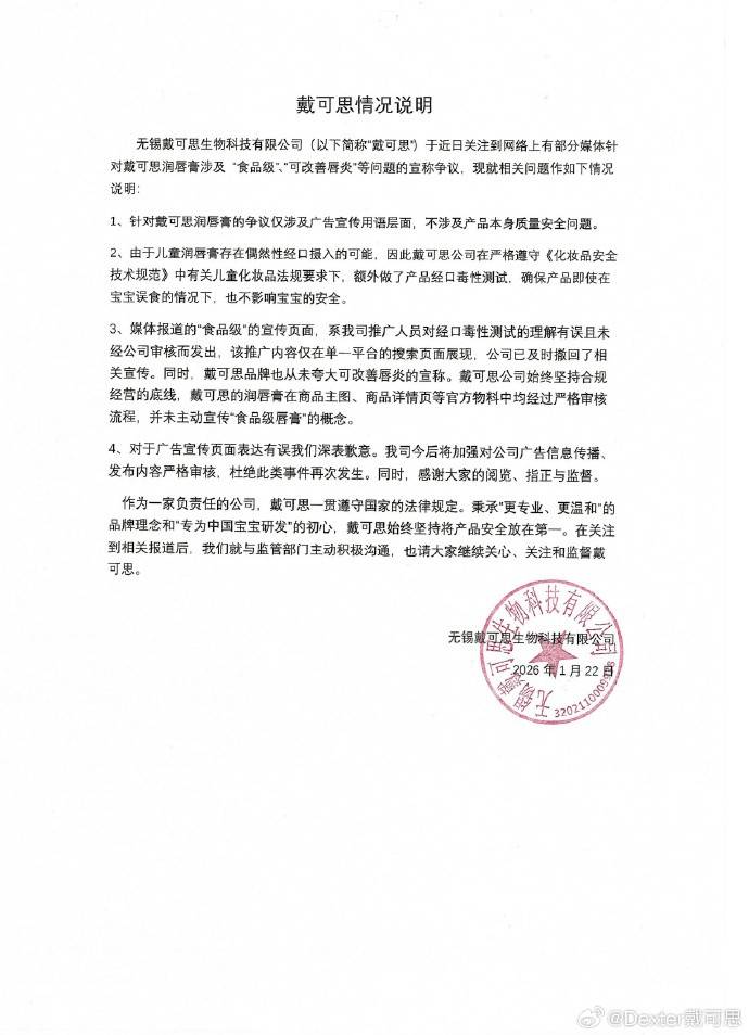 次日,戴可思微博发文称,针对戴可思润唇膏的争议仅涉及广告宣传用语层面,不涉及产品本身质量安全问题。其称,公司在遵守《化妆品安全技术规范》中有关儿童化妆品法规要求下,额外做了产品经口毒性测试,确保产品即使在宝宝误食的情况下,不影响宝宝安全。