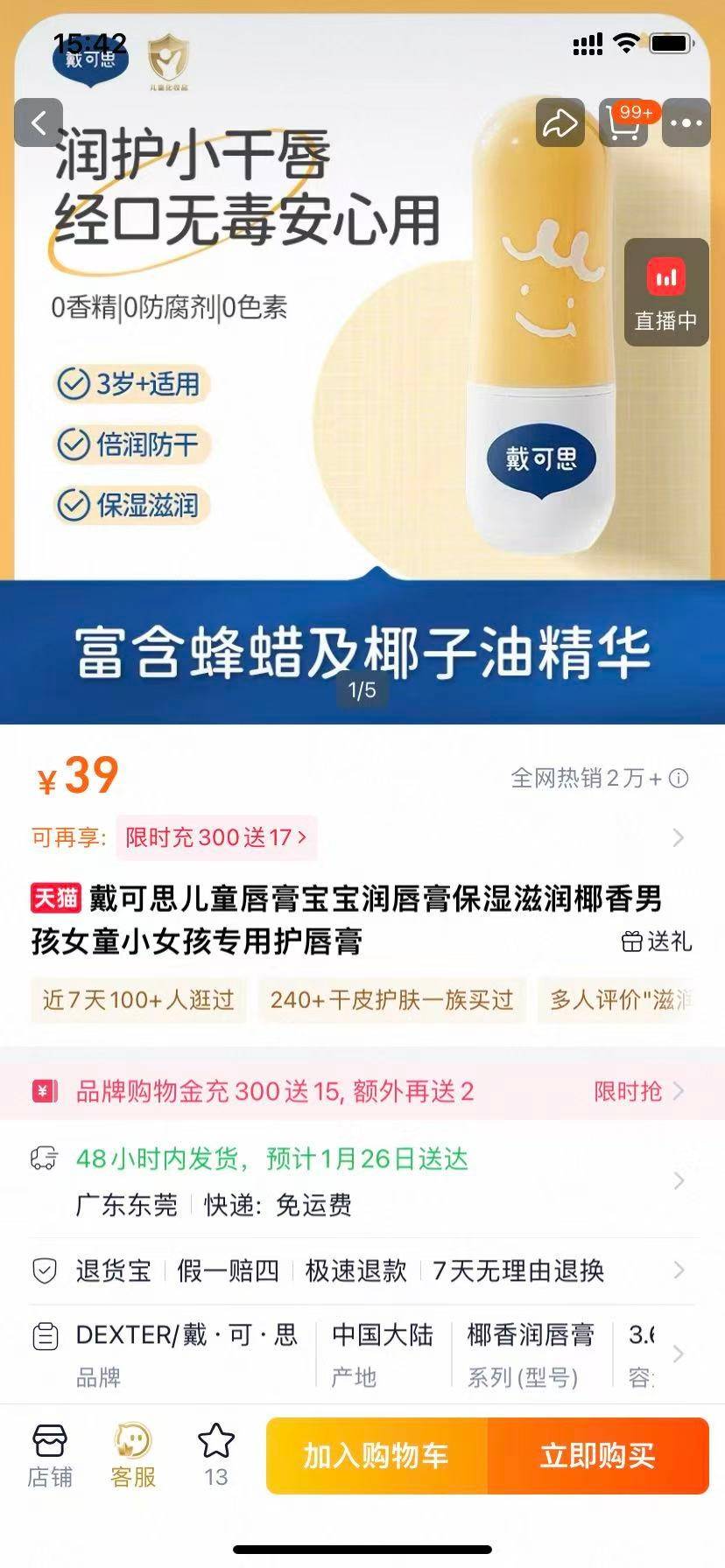 其中,戴可思旗舰店售卖的“戴可思婴儿护唇膏”在搜索结果界面宣称为“食品级润唇膏”,并标注“宝宝误舔无忧”;在商品详情界面还以“权威检测机构鉴定通过”为宣传点,强调产品“经口无毒 润唇不怕舔”。其贴出的检测报告图片写着:“结果汇总:根据《化妆品安全技术规范》(2015年版)对送检样品进行安全性检验,结果如下:(一)毒理学试验:急性经口毒性试验结果:实际无毒”。