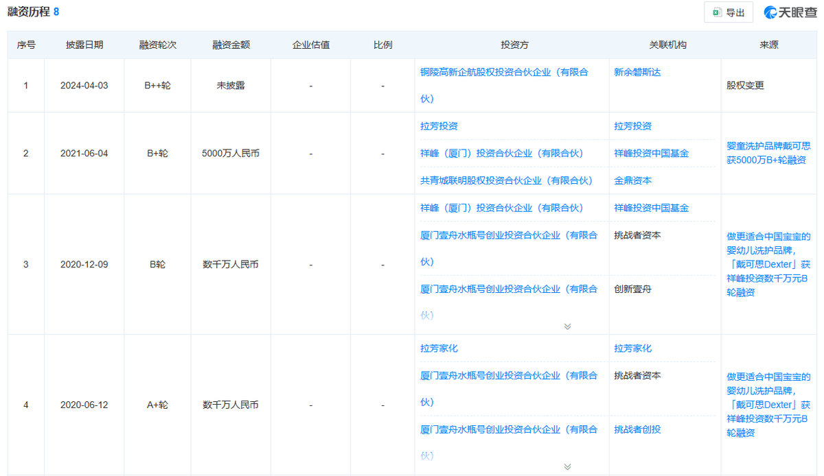 强劲的增长势头使其持续获得资本加持。天眼查显示,戴可思母公司至今已完成共计9轮融资,已披露融资金额超过5000万元,最新一轮发生于2024年4月。其投资方阵容堪称豪华,包括拉芳家化、丸美生物、华熙生物关联基金等产业资本。