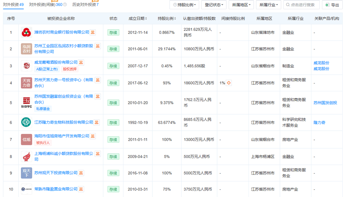 天眼查显示,隆力奇集团投资了两家小额贷款公司,苏州工业园区泓润农村小额贷款股份有限公司、上海杨浦科诚小额贷款股份有限公司,目前这两家公司处于存续状态。