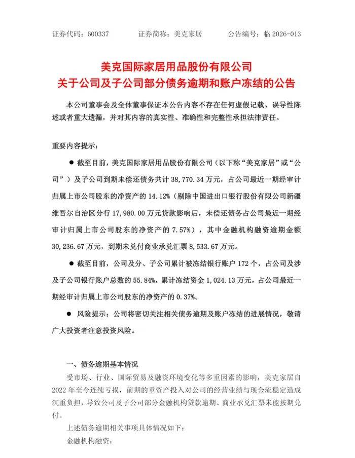 经营层面的困境正逐步传导至财务端,美克家居的债务压力已全面爆发。1月30日公司公告披露,截至目前公司及子公司到期未偿还债务累计达3.88亿元,其中金融机构融资逾期本金3.02亿元,商业承兑汇票未兑付金额8533.67万元,逾期债务占公司最近一期经审计净资产的14.12% 。债务逾期同时引发了账户冻结问题,公司及分子公司已有172个银行账户被冻结,占账户总数的55.84%,冻结资金约1024.13万元,对公司正常资金周转和生产经营构成显著影响 。