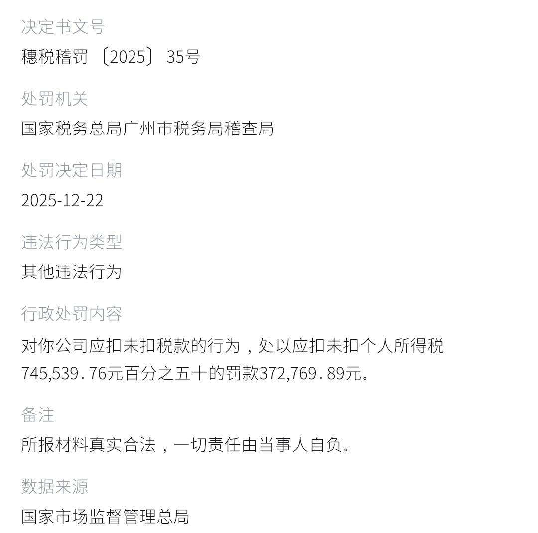 天眼查显示,去年12月22日,广州壹加壹整形美容医院还曾因应扣未扣税款行为,被处以应扣未扣个人所得税745539.76元百分之五十的罚款,共计32.27万元。
