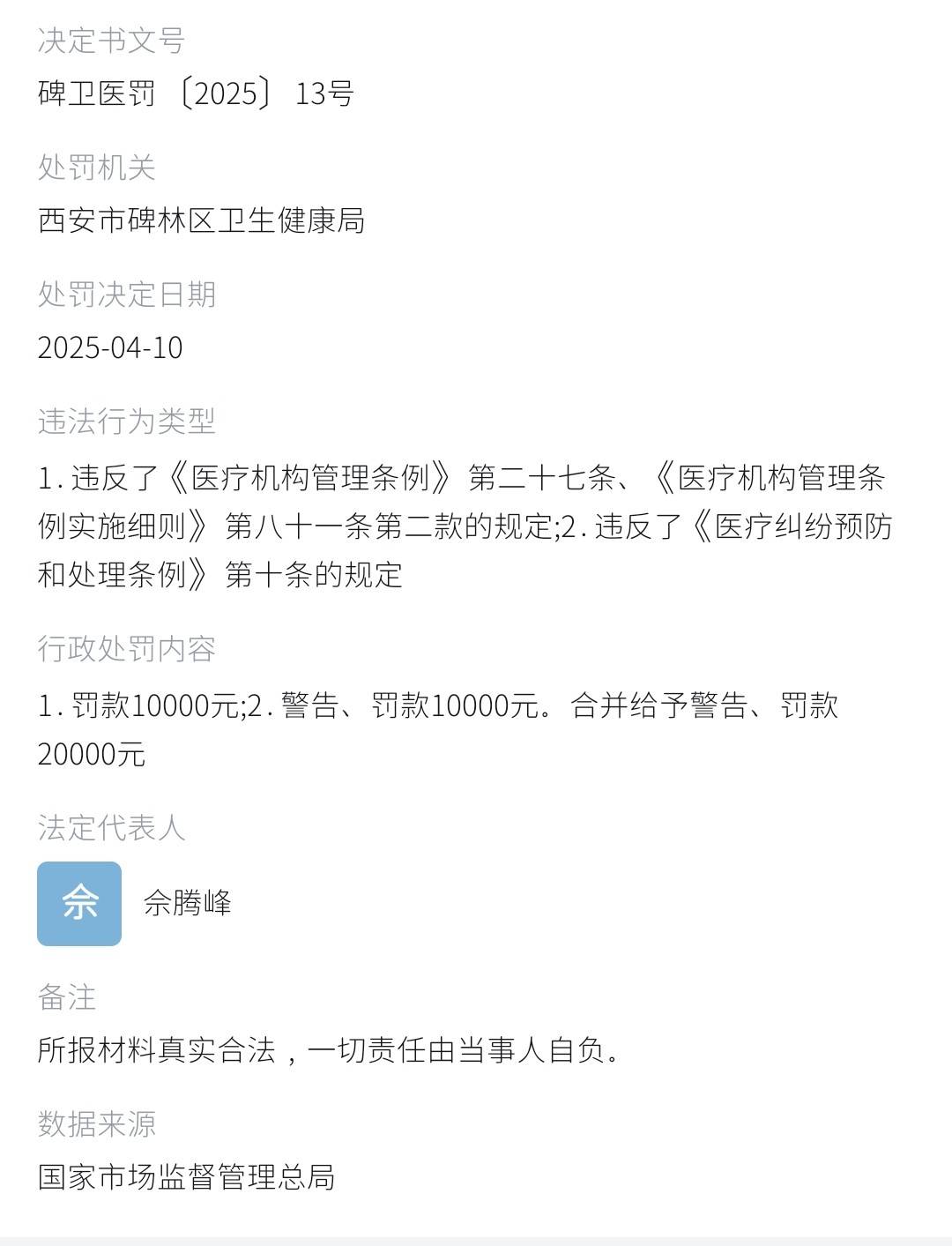2025年4月10日,西安市碑林区卫生健康局认定西安壹加壹医疗美容医院有限公司违反《医疗机构管理条例》第二十七条及其实施细则第八十一条第二款关于诊疗活动范围的规定,并违反《医疗纠纷预防和处理条例》第十条关于医疗质量安全管理制度的要求,对其合并作出警告并罚款人民币20000元的行政处罚。