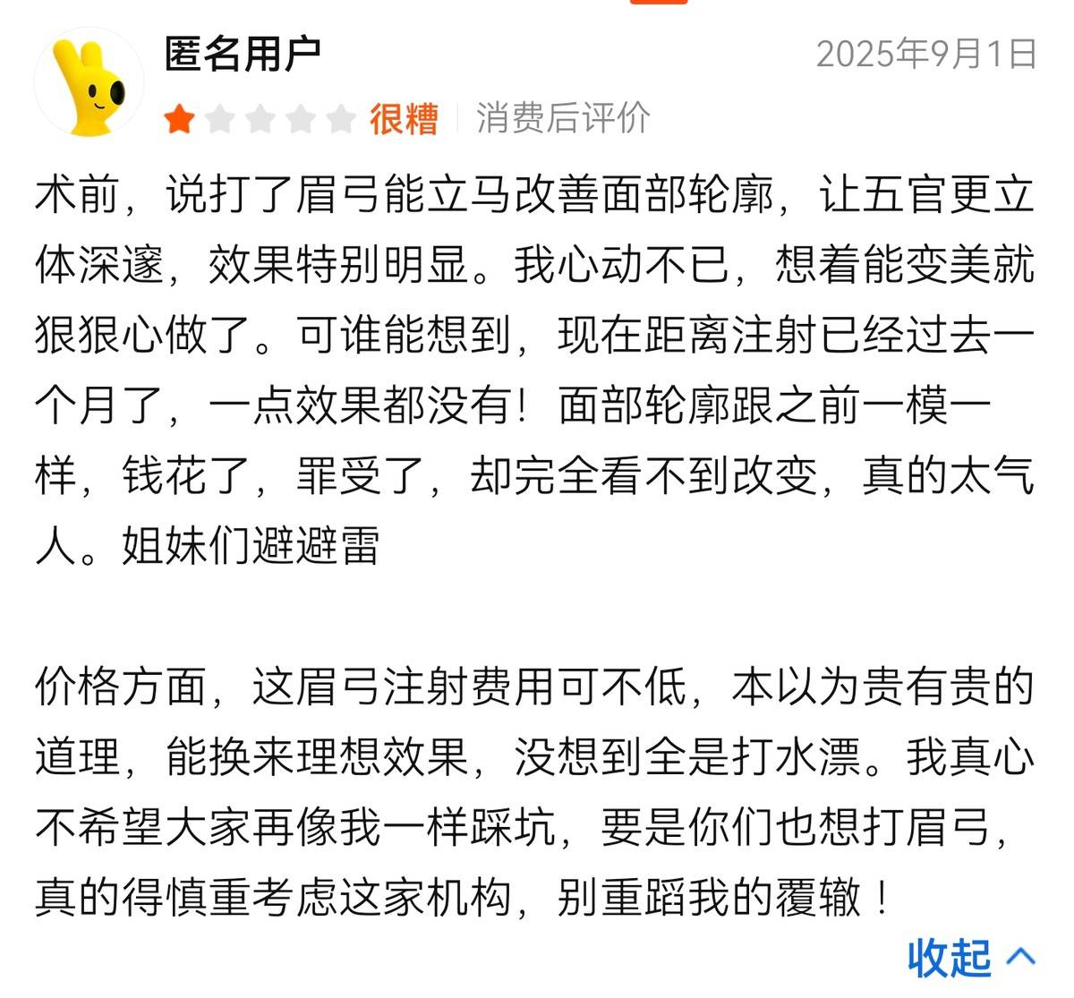在价格方面,该消费者表示眉弓注射费用不低,本以为贵有贵的道理,能换来理想效果,没想到全是白费。