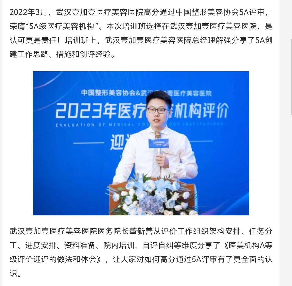 2023年6月6日,武汉壹加壹医疗美容医院承办了中国整形美容协会的医疗美容机构评价迎评培训班。