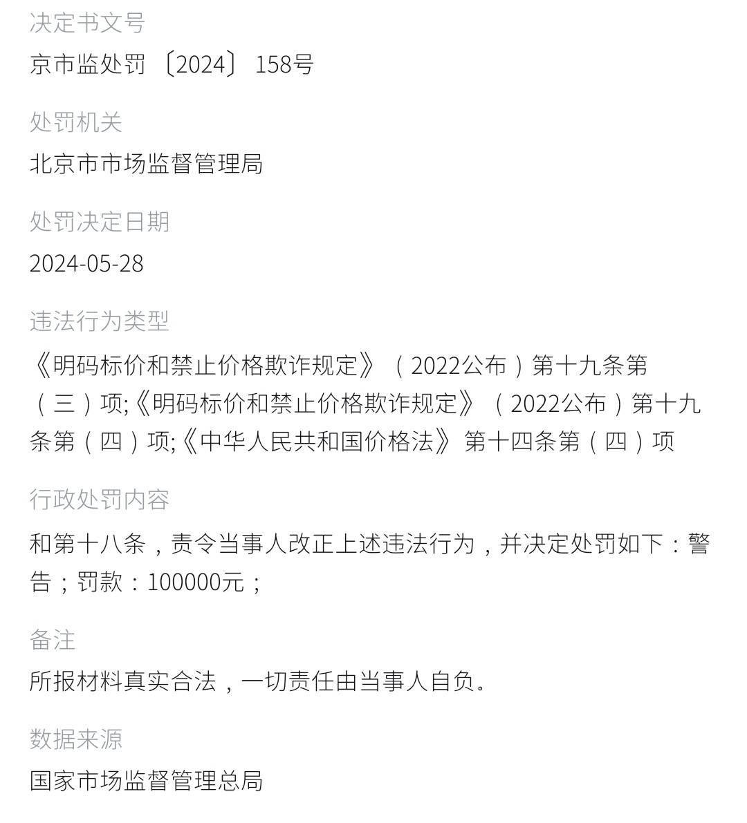2024年5月28日,北京市市场监督管理局认定北京壹加壹医疗美容诊所有限公司违反《明码标价和禁止价格欺诈规定》第十九条第三项、第四项及《中华人民共和国价格法》第十四条第四项,构成价格欺诈行为,责令其改正并对其作出警告、罚款人民币100000元的行政处罚。