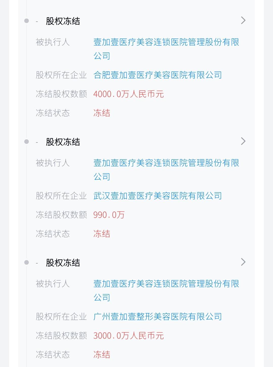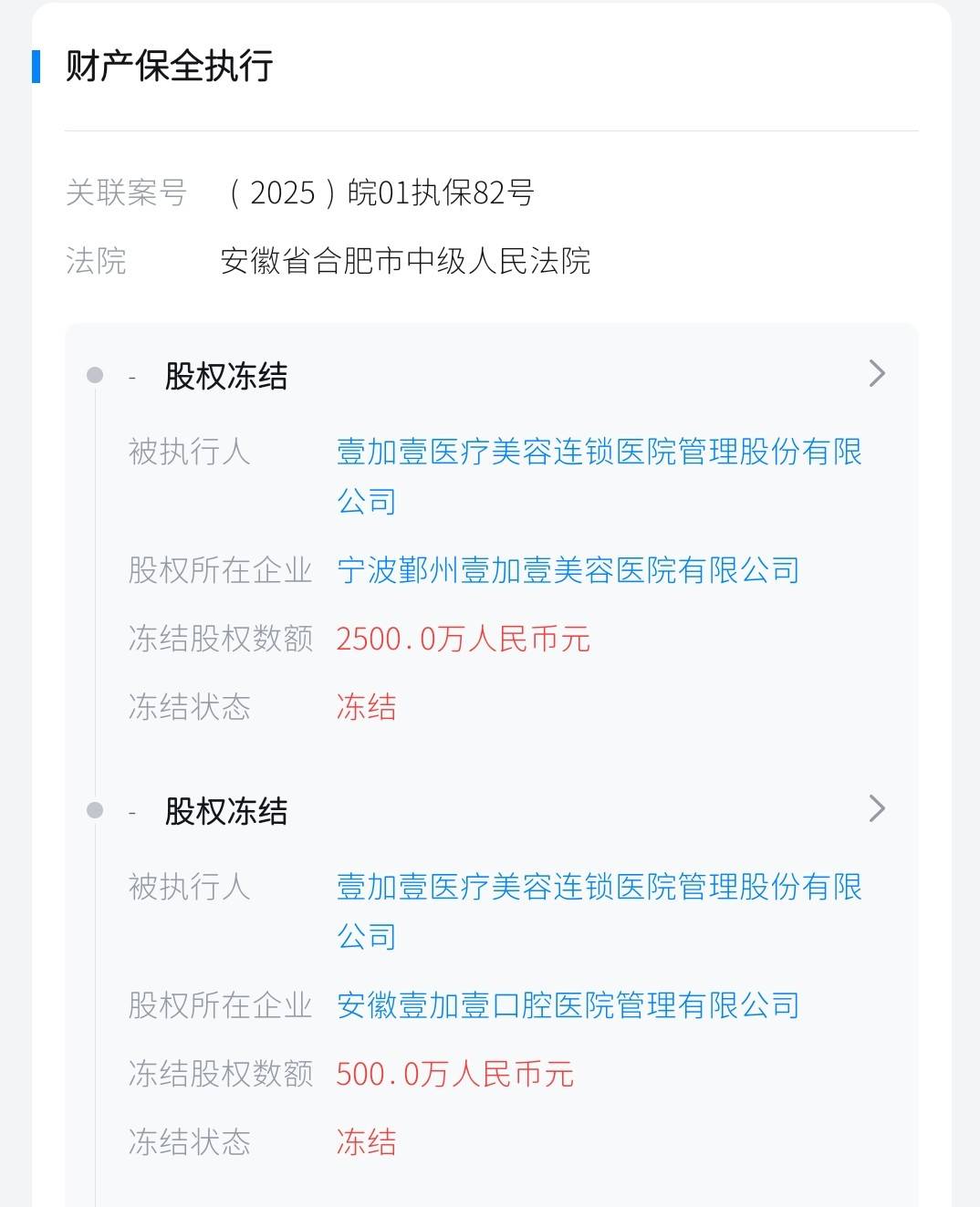 依据(2025)皖01财保1号裁定,安徽省合肥市中级人民法院发出(2025)皖01执保82号执行通知书,将壹加壹医疗美容连锁医院管理股份有限公司所持:宁波鄞州壹加壹美容医院有限公司、安徽壹加壹口腔医院管理有限公司、合肥壹加壹医疗美容医院有限公司、武汉壹加壹医疗美容医院有限公司、广州壹加壹整形美容医院有限公司、东莞壹加壹整形美容医院有限公司等公司股权总冻结股权数额达1亿元人民币以上。