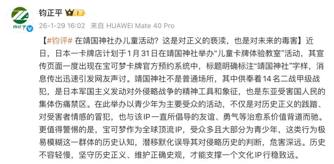 1月29日,钧正平工作室官方微博发文《在靖国神社办儿童活动?这是对正义的亵渎,也是对未来的毒害》。靖国神社不是普通场所,其中供奉着14名二战甲级战犯,是日本军国主义发动对外侵略战争的精神工具和象征,也是东亚受害国人民的集体伤痛禁区。在此举办以青少年为主要受众的活动,不仅是对历史正义的践踏、对受害者情感的冒犯,也与该IP一直所倡导的友谊、勇气等治愈系价值背道而驰。