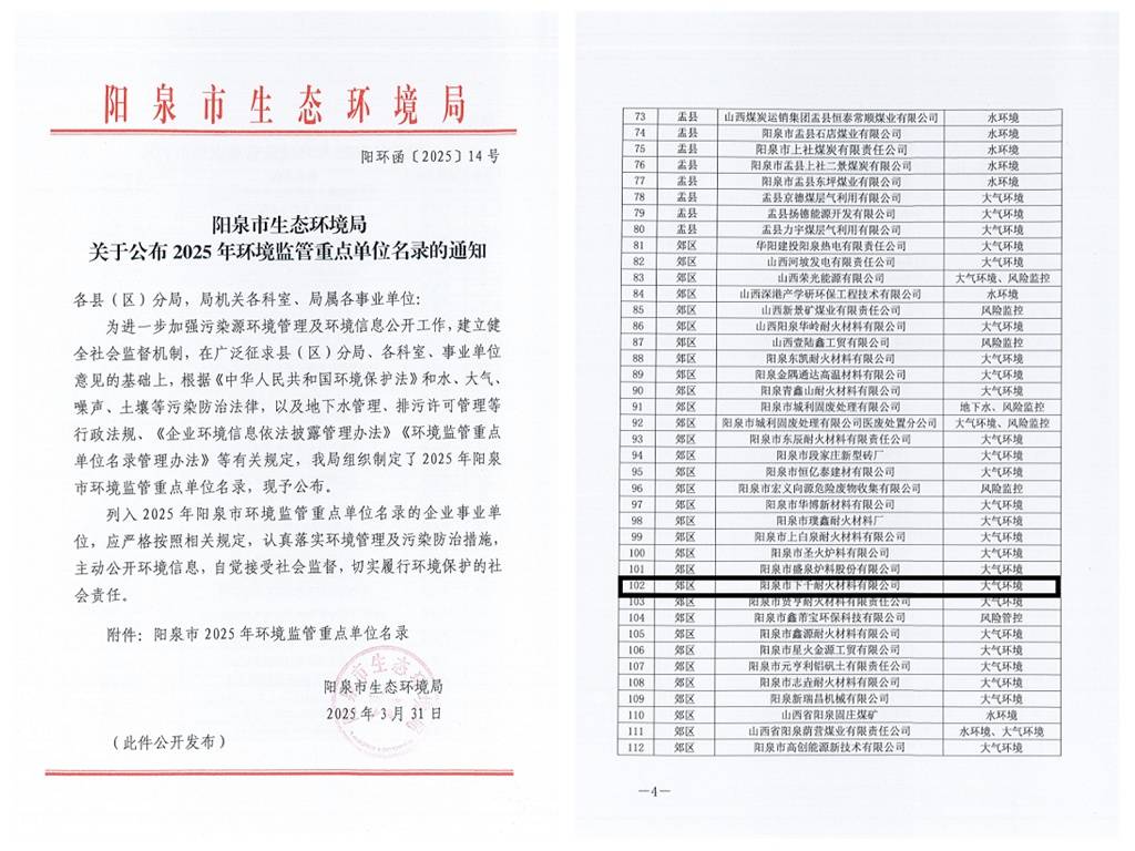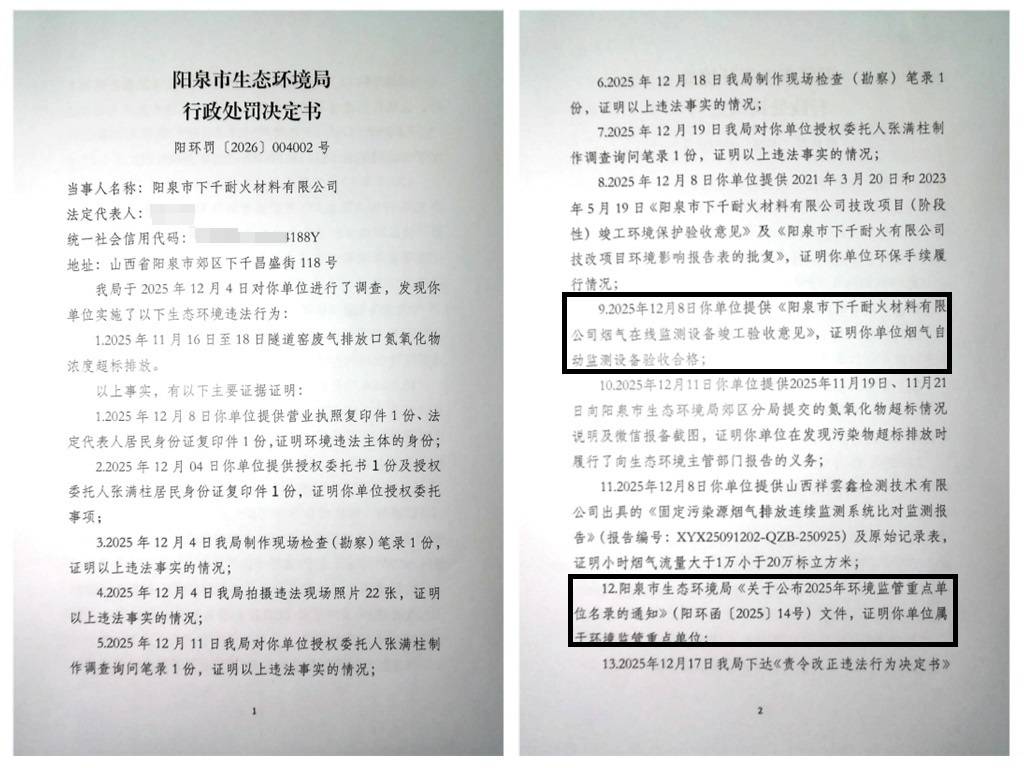 处罚文书显示,调查过程中收集了现场检查笔录、调查询问笔录、自动监测设备验收合格、监测报告、企业环保验收文件等十余项证据。其中,阳泉市生态环境局发布的《关于公布2025年环境监管重点单位名录的通知》(阳环函〔2025〕14号)明确将下千耐火列为“环境监管重点单位”。这类单位通常意味着环境风险较高、排污量较大,需接受更严格的监管。