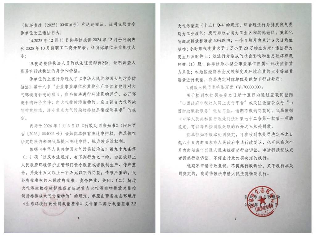 根据阳泉市生态环境局出具的《行政处罚决定书》(阳环罚〔2026〕004002号),下千耐火在2025年11月16日至18日期间,其隧道窑废气排放口的氮氧化物浓度持续超标。该局依据《中华人民共和国大气污染防治法》第九十九条,并结合山西省生态环境行政处罚裁量基准,对企业处以17万元罚款。